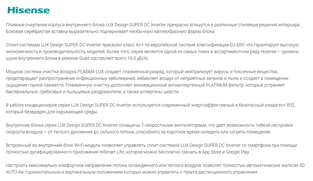 Компания Хайсенс уделяет большое значение внешнему виду своего оборудования, вкладывая огромные средства в разработку промышленного дизайна выпускаемой продукции, в чем вы можете легко убедиться, сравнив кондиционеры Hisense с конкурентами. Но не меньшее значение компания уделят технологиям и качеству производства.